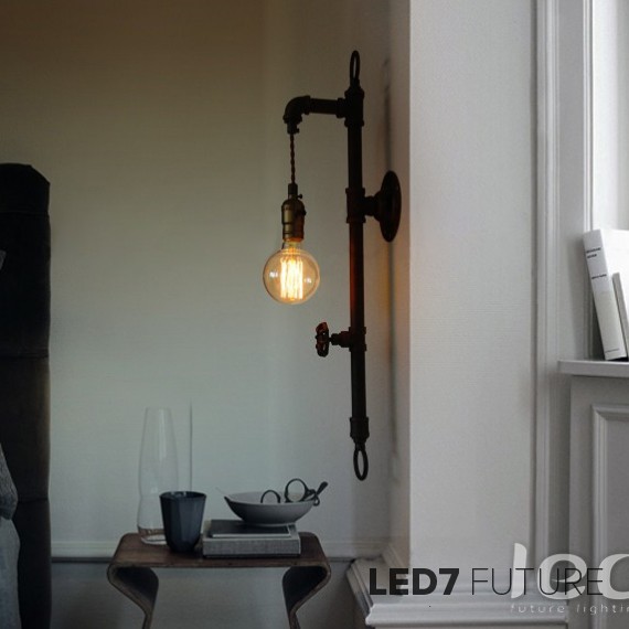 Осветительный прибор выполнен весьма креативно: его форма повторяет смеситель для подачи воды эпохи XIX-XX века. Конструкцию светильника дополняет  декоративный механизм перекрытия подачи воды. Насыщенный черный или коричневый матовый цвет выгодно выделяет данный осветительный прибор на светлом фоне. Патрон и сама лампочка висят на специальном декоративном канате, который придает светильнику еще больше шарма. Крепежный элемент прибора напоминает круглую пластину большого размера для надежного монтажа.